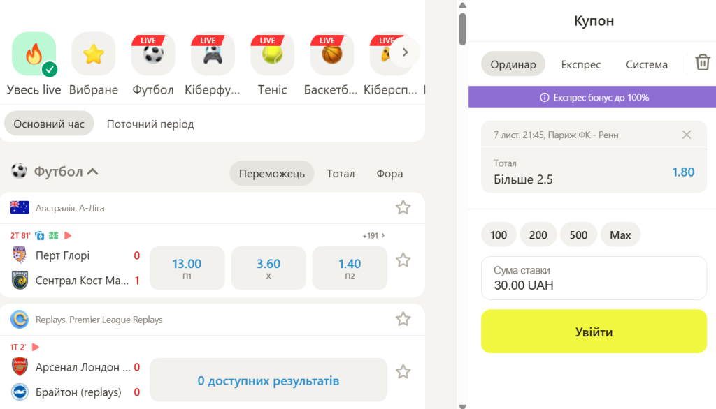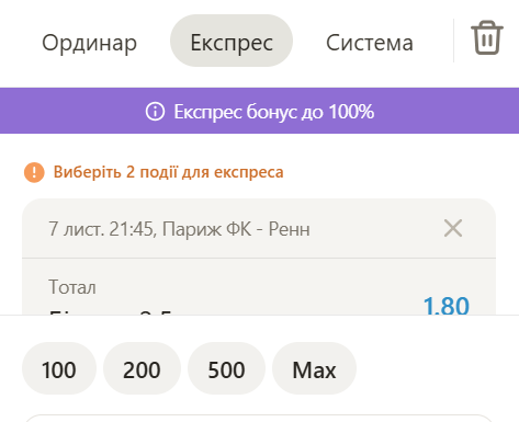 Експрес об’єднує кілька результатів з різних подій в одну ставку. Коефіцієнти всіх результатів перемножуються, створюючи високий потенційний виграш. Мінімальна кількість подій в експресі – 2, максимальна – 20. Якщо хоча б один результат програє, вся ставка втрачається.